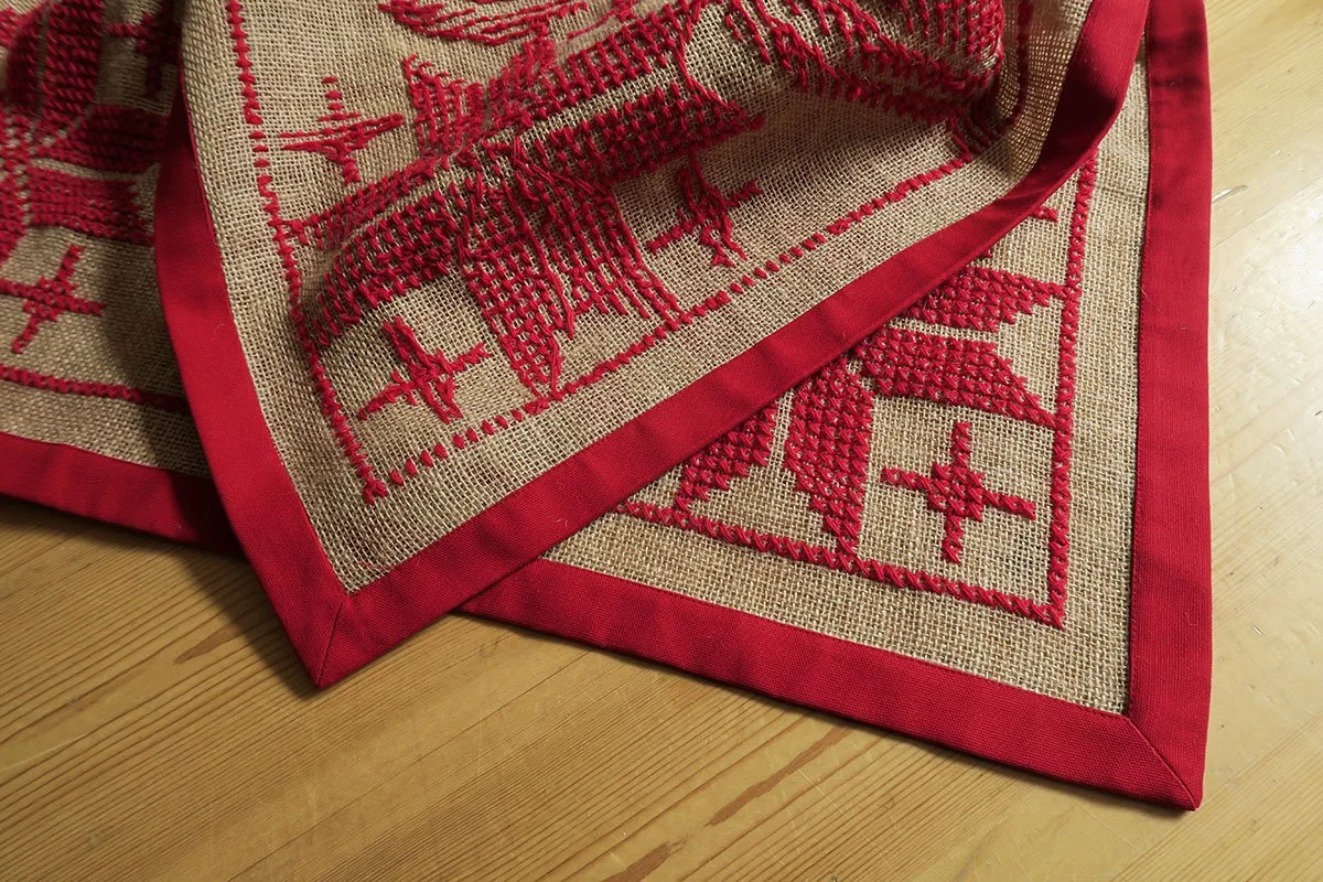 Firkantet juletræstæppe med Bred påsyet stof-bort 1400 kr